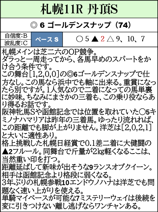 そして札幌メインで対抗○ノースブリッジが五番人気激勝!予想にあった通り、番手追走から押し切る形でした。さすがの悪魔的展開眼。